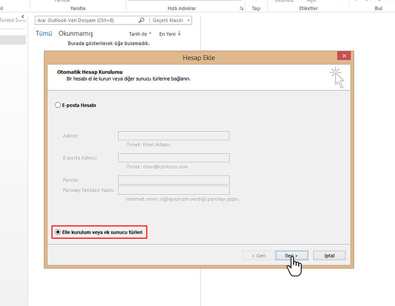 Açılan pencerede "Elle kurulum veya ek sunucu türleri" seçeneğini seçip "İleri" butonuna tıklıyoruz.