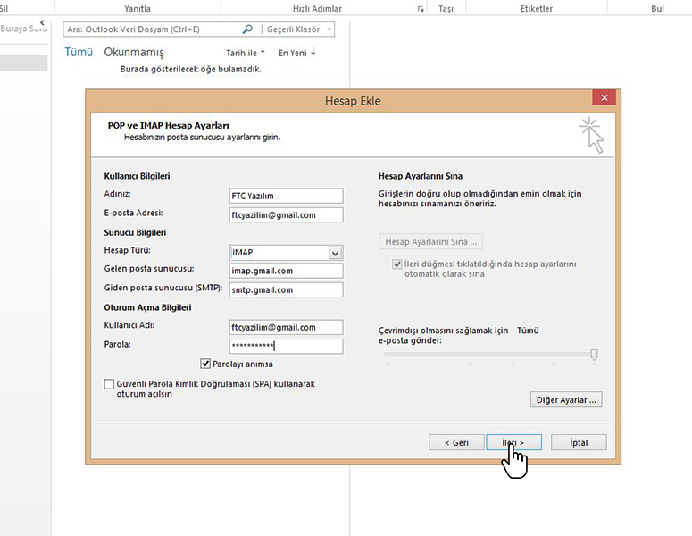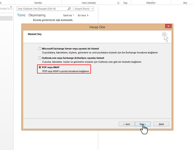 "POP veya IMAP" seçeneğini seçip "İleri" butonuna tıklıyoruz.