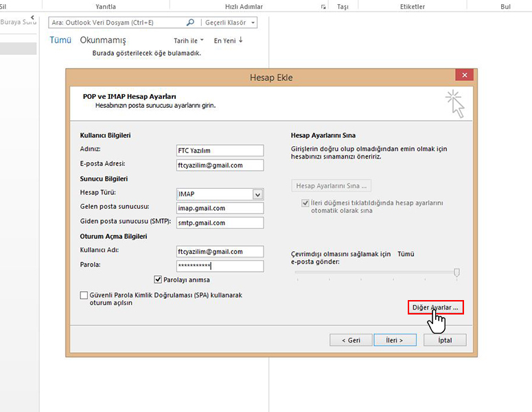 Hesap türünü "IMAP" seçip ayarlarımızı resimde görüldüğü gibi yapılandırıyoruz ve sonrasında "Diğer Ayarlar" butonuna tıklıyoruz.