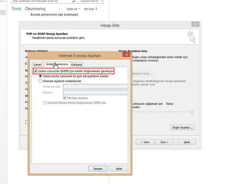 Açılan pencerede "Giden Sunucusu" sekmesini seçip ayarlarımızı görüldüğü gibi yapıyoruz.