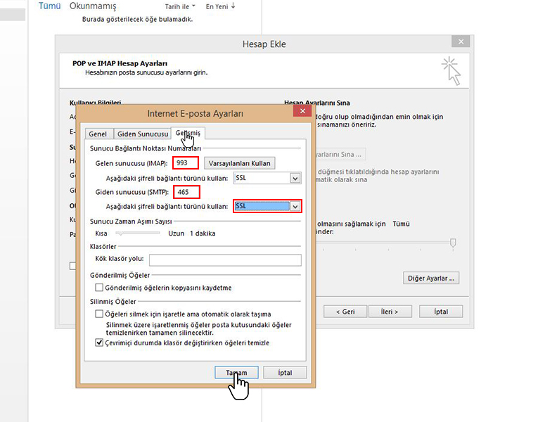 Daha sonra "Gelişmiş" sekmesini seçip ayarlarımızı görüldüğü gibi yapıp "Tamam" butonuna tıklıyoruz.